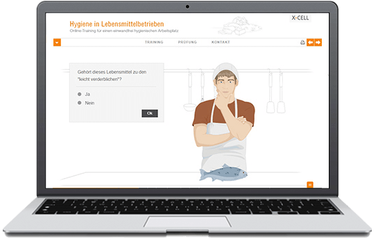 Mit dem X-CELL-Training „Hygiene in lebensmittelverarbeitenden Betrieben“ erfüllen Sie die gesetzlichen Vorgaben auf einfache, effiziente und kostengünstige Art. Es vermittelt Wissen anhand praxisorientierter Beispiele und interaktiver Lernsituationen, welche zu einer gleichbleibend hohen Motivation Ihrer Mitarbeitenden führt. Die qualitativ hochwertig aufbereiteten Inhalte fördern den Spaß am Lernen und eine erfolgreiche Schulungsmaßnahme.