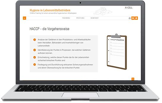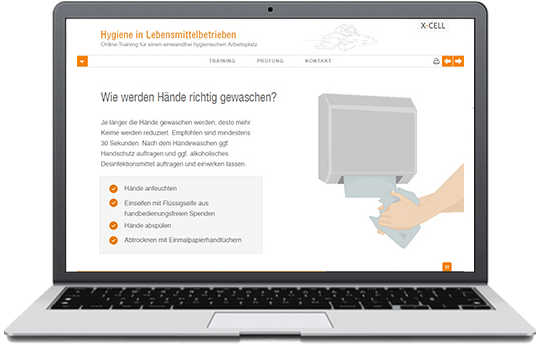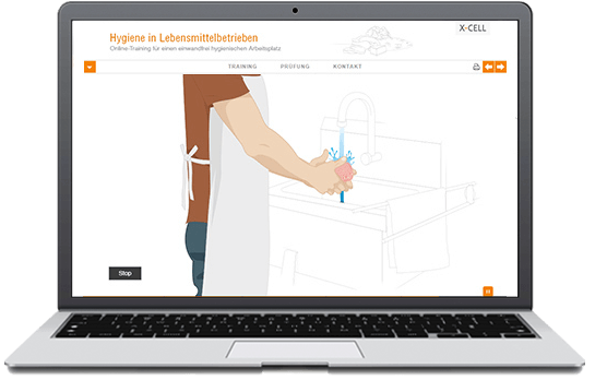 Mit dem X-CELL-Training „Hygiene in lebensmittelverarbeitenden Betrieben“ erfüllen Sie die gesetzlichen Vorgaben auf einfache, effiziente und kostengünstige Art. Es vermittelt Wissen anhand praxisorientierter Beispiele und interaktiver Lernsituationen, welche zu einer gleichbleibend hohen Motivation Ihrer Mitarbeitenden führt. Die qualitativ hochwertig aufbereiteten Inhalte fördern den Spaß am Lernen und eine erfolgreiche Schulungsmaßnahme.